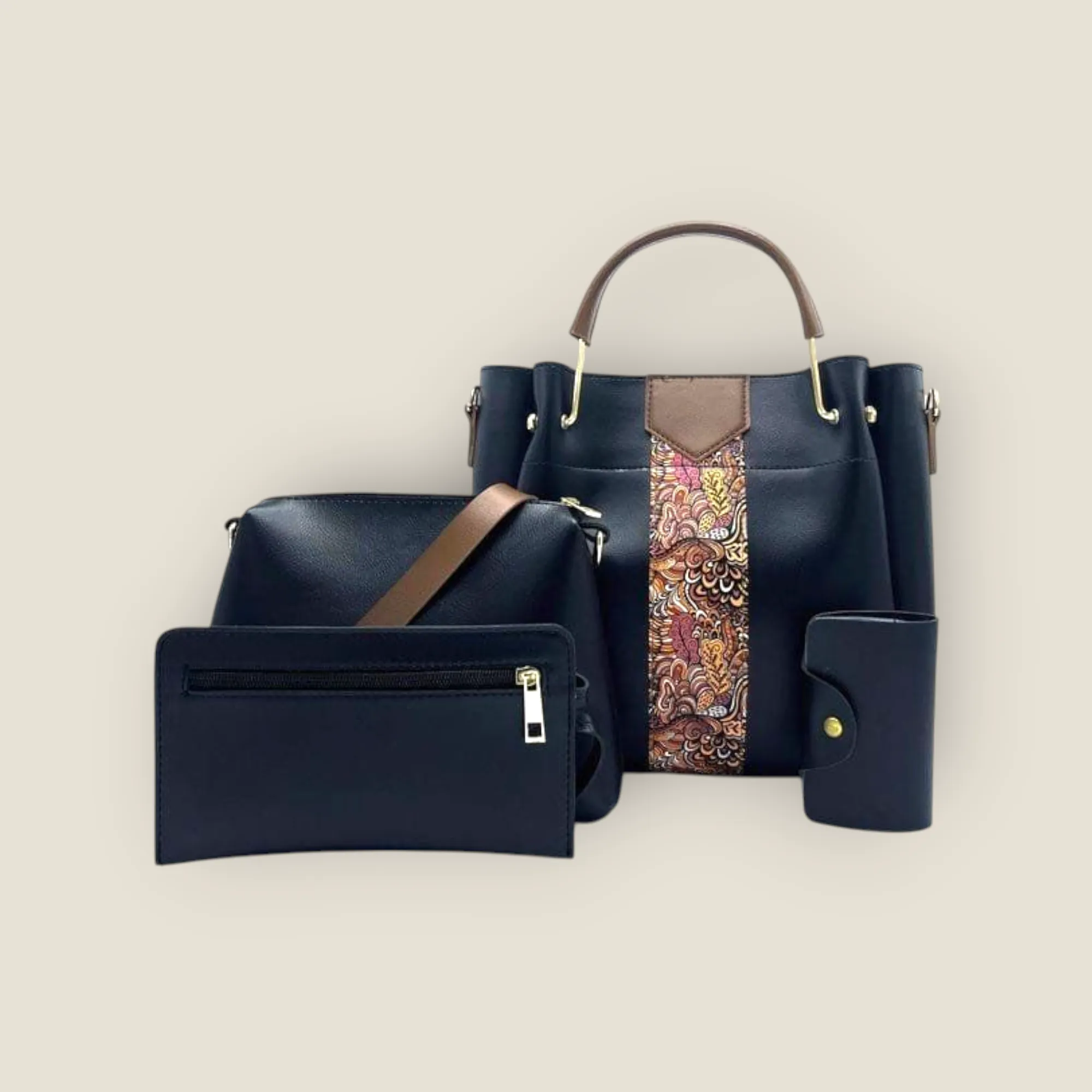 The 4-in-1 Black Bucket Bag Set with Colorful Printed Panel is the ultimate accessory for those seeking style and functionality in one elegant design. Featuring a stunning black base with vibrant printed panels, this set offers versatility to suit various occasions—whether you're heading to work, going on a quick shopping spree, or enjoying an evening outing.